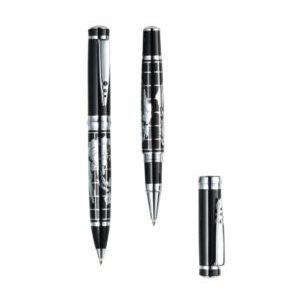 Pisaći set Intercontinental sadrži dvije kemijske olovke s plavom i crnom tintom, kromiranu mapu svijeta na kemijskama. Dostavlja se u elegantnim crnim kutijama s aluminijskom pločicom na sebi koja je idealno mjesto za Vaš logo.